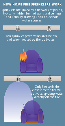 Fire sprinklers are only activated when the temperature in the room in which a fire is burning exceeds the preset temperature of the sprinkler head — nominally 135°F-165°F. Sprinklers operate as individual heat sensors, meaning that water is only released in the area where there is a fire. They are not activated by smoke. Often in a room with two sprinkler heads, only one operates. Sprinklers typically deliver 25gal/minute (compared to 250gal/min from a fire hose); systems are usually plumbed with copper pipe or rigid CPVC pipe, fed off the rising main. Ideally, they require a 1 inch cold feed into the house, as the systems need a good flow. This can be integrated with a rainwater recycling system. |